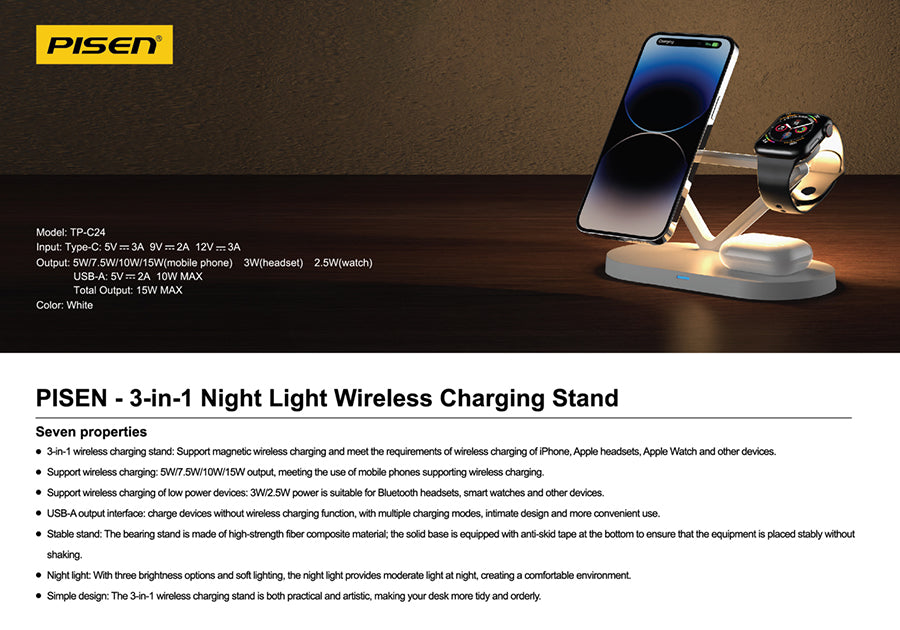 PISEN TP-C24 3-in-1 Night Light Wireless Charging Stand